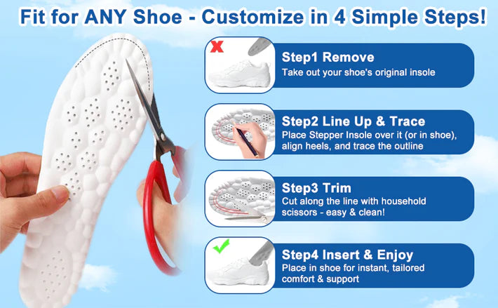 The stepper insoles for men and women is ideal for people who stand for long time—workers, athletes, seniors, and more. These insoles provide reliable comfort and stability in any footwear. One pair adapts to your life, offering all-day relief and energy.